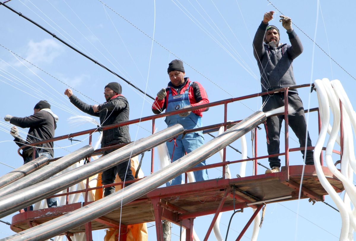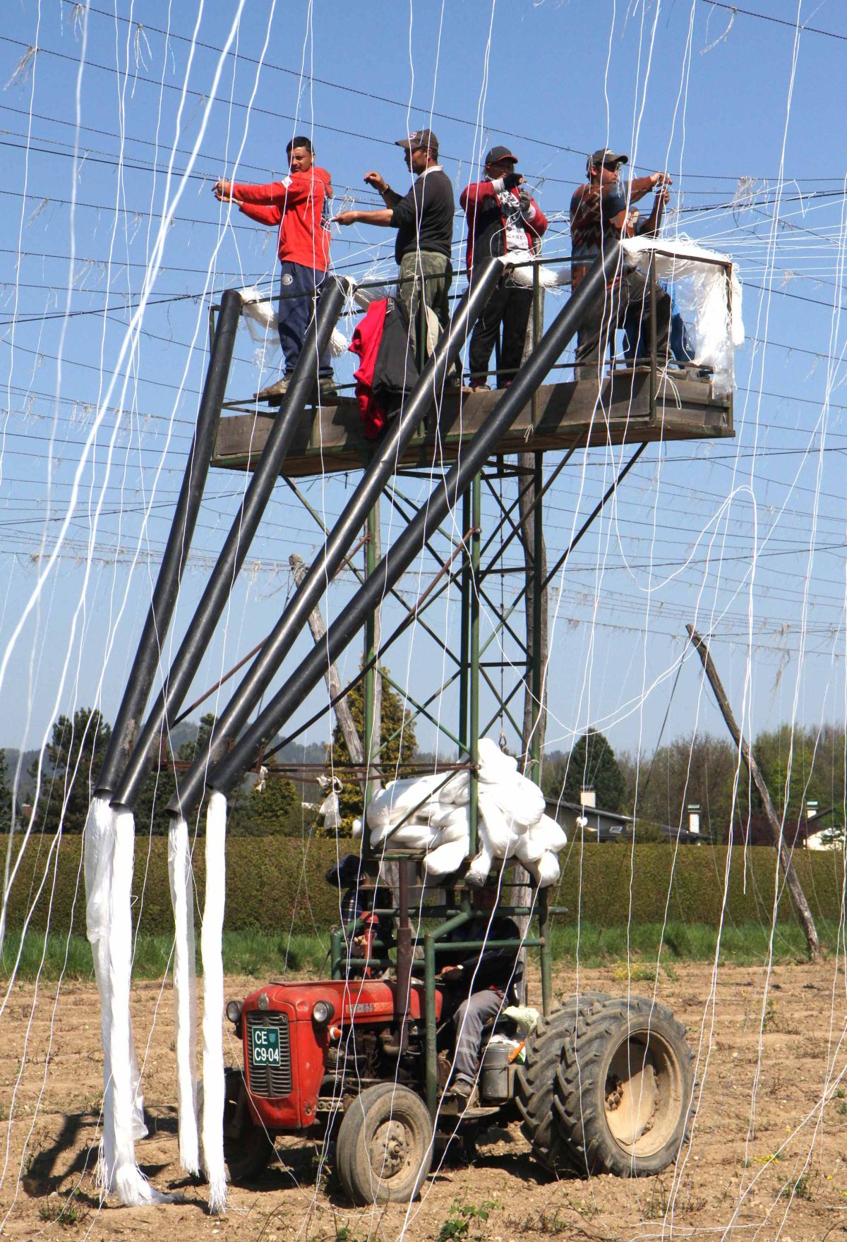 Tisti, ki so hmelj že odorali in obrezali, so začeli napeljevati vrvice, po katerih se bo hmelj vzpenjal proti vrhu žičnic.